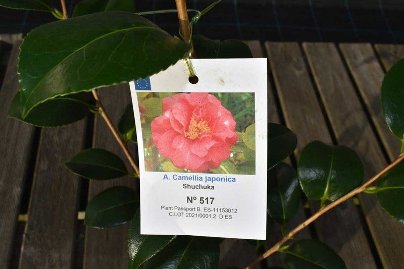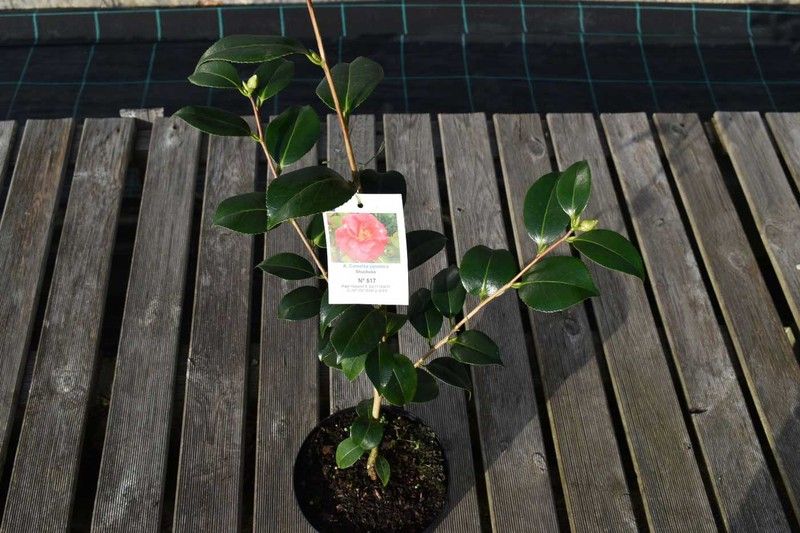 Camellia japonica "Shuchuka" plantas cultivadas em vaso de 2,5 litros e altura de 30 cm.