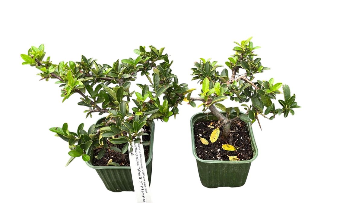 As plantas de Pyracantha soleil d'or, vulgarmente conhecidas por espinheiro-alvar, produzem frutos amarelos. Estamos a enviar esta cultivar cultivada num vaso.