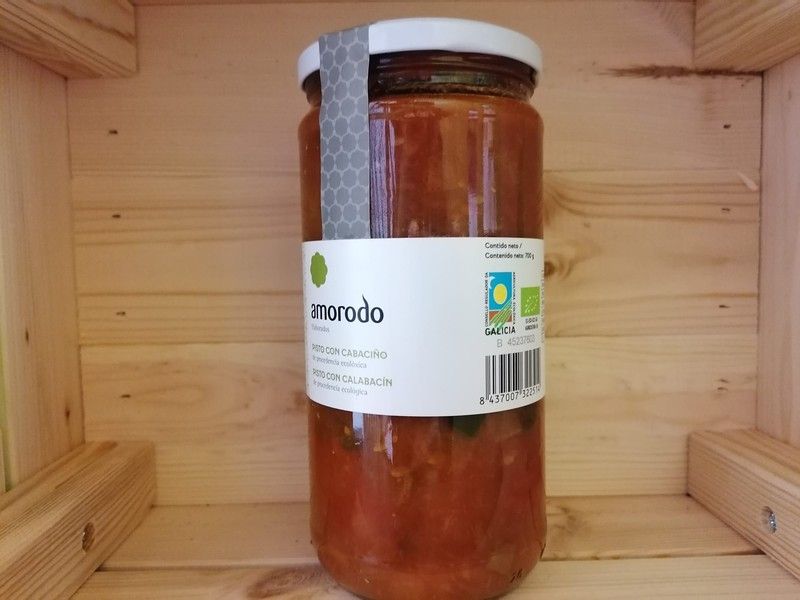 A ratatouille de abobrinha orgânica da Amorodo é feita com os seguintes ingredientes: tomate, cebola, abobrinha, pimenta verde e vermelha, azeite extra-virgem, sal marinho e alho.